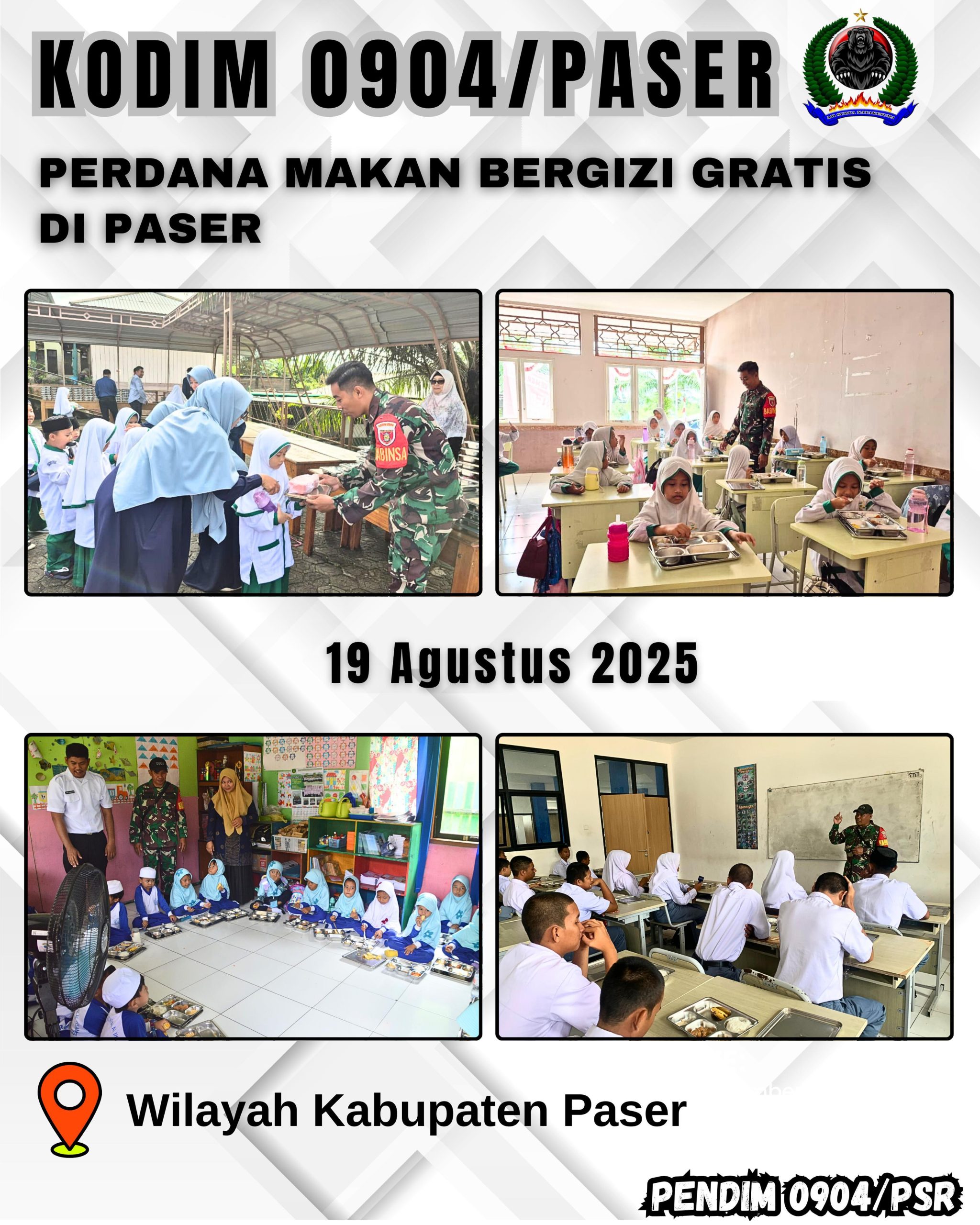 Kodim 0904/Psr, Korem 091/ASN, Kodam VI/Mlw – Kasdim 0904/Psr mengikuti kegiatan Launching Kegiatan Makan Bergizi Gratis (MBG) dalam rangka meningkatkan Sumber Daya Manusia (SDM) Indonesia pada hari Selasa tanggal 19 Agustus 2025 pukul 12.00 WITA bertempat di Wilayah Kabupaten Paser, Selasa (19/8/25).