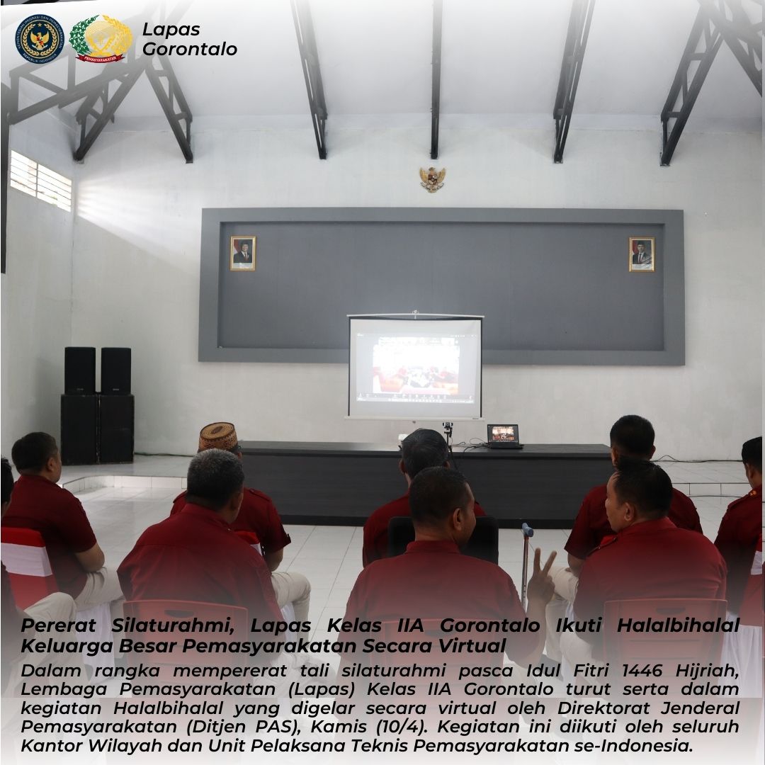 Gorontalo – Dalam rangka mempererat tali silaturahmi pasca Idul Fitri 1446 Hijriah, Lembaga Pemasyarakatan (Lapas) Kelas IIA Gorontalo turut serta dalam kegiatan Halalbihalal yang digelar secara virtual oleh Direktorat Jenderal Pemasyarakatan (Ditjen PAS), Kamis (10/4). Kegiatan ini diikuti oleh seluruh Kantor Wilayah dan Unit Pelaksana Teknis Pemasyarakatan se-Indonesia.