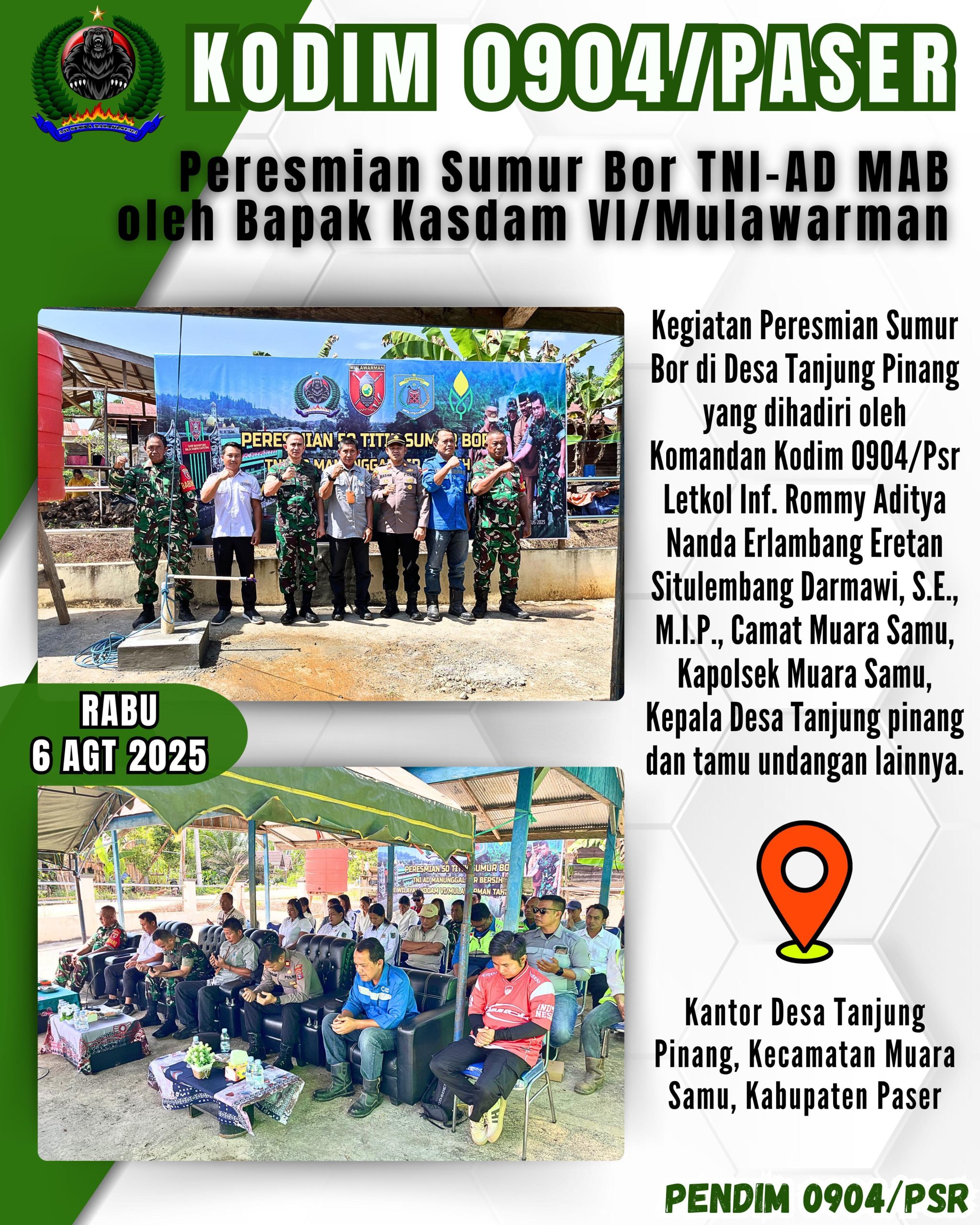 Kodim 0904/Psr, Korem 091/ASN, Kodam VI/Mlw – Pada hari Rabu tanggal 6 Agustus 2025 pukul 09.30 Wita, bertempat di Kantor Desa Tanjung Pinang, Kecamatan Muara Samu, Kabupaten Paser telah dilaksanakan Kegiatan Vicon Peresmian 50 Titik Sumur Bor TNI-AD Manunggal air Bersih Wilayah Kodam VI/Mulawarman, Rabu (6/8/2025).