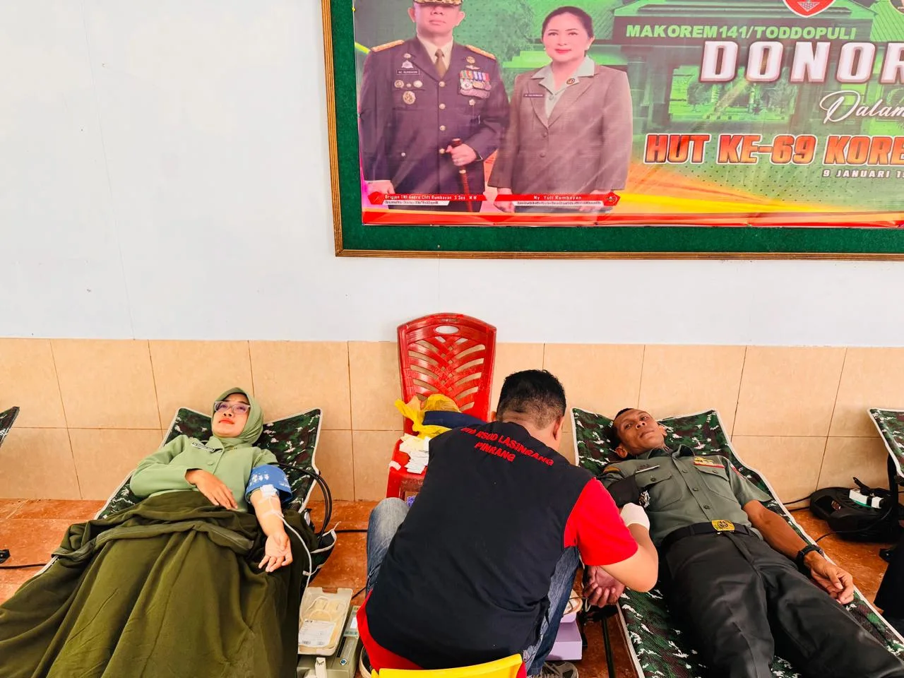 Pinrang_ Dalam rangka memperingati Hari Ulang Tahun (HUT) ke-69 Korem 141/Toddopuli, Kodim 1404/Pinrang menggelar kegiatan bakti sosial berupa donor darah, sebagai wujud kepedulian TNI terhadap kemanusiaan dan kesehatan masyarakat, Senin (05/01/2026).