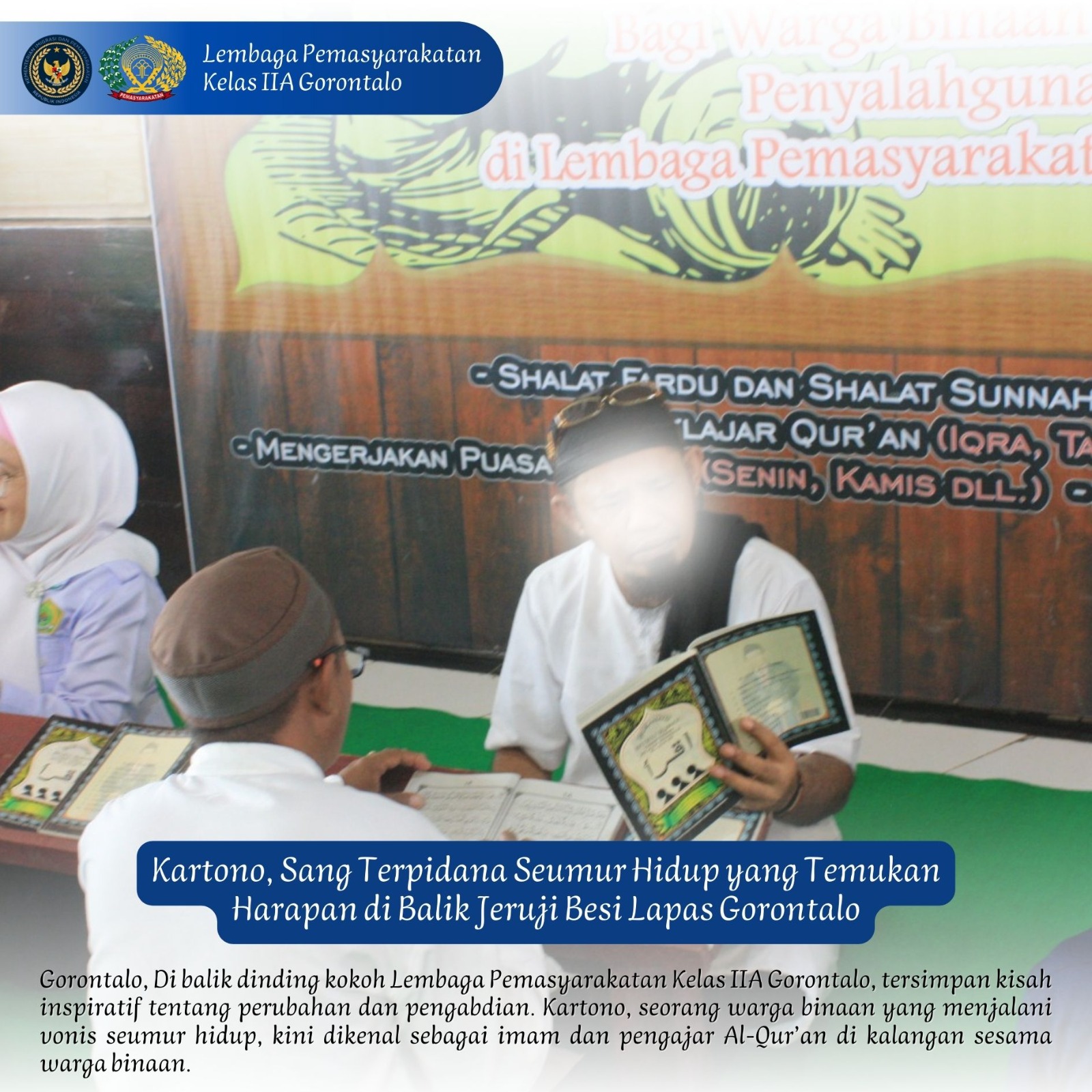 Gorontalo, Di balik dinding kokoh Lembaga Pemasyarakatan Kelas IIA Gorontalo, tersimpan kisah inspiratif tentang perubahan dan pengabdian. Kartono, seorang warga binaan yang menjalani vonis seumur hidup, kini dikenal sebagai imam dan pengajar Al-Qur’an di kalangan sesama warga binaan.