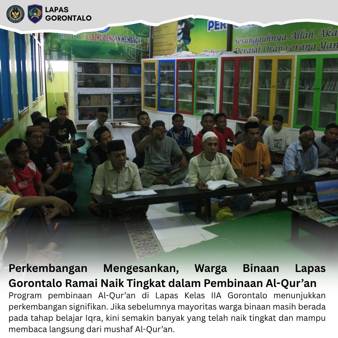 Gorontalo – INFO_PAS – Program pembinaan Al-Qur’an di Lapas Kelas IIA Gorontalo menunjukkan perkembangan signifikan. Jika sebelumnya mayoritas warga binaan masih berada pada tahap belajar Iqra, kini semakin banyak yang telah naik tingkat dan mampu membaca langsung dari mushaf Al-Qur’an.