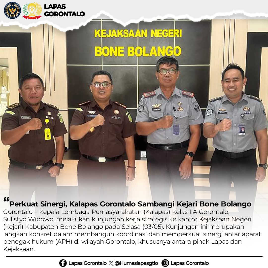 Gorontalo _INFO_PAS – Kepala Lembaga Pemasyarakatan (Kalapas) Kelas IIA Gorontalo, Sulistyo Wibowo, melakukan kunjungan kerja strategis ke kantor Kejaksaan Negeri (Kejari) Kabupaten Bone Bolango pada Selasa (03/05). Kunjungan ini merupakan langkah konkret dalam membangun koordinasi dan memperkuat sinergi antar aparat penegak hukum (APH) di wilayah Gorontalo, khususnya antara pihak Lapas dan Kejaksaan.