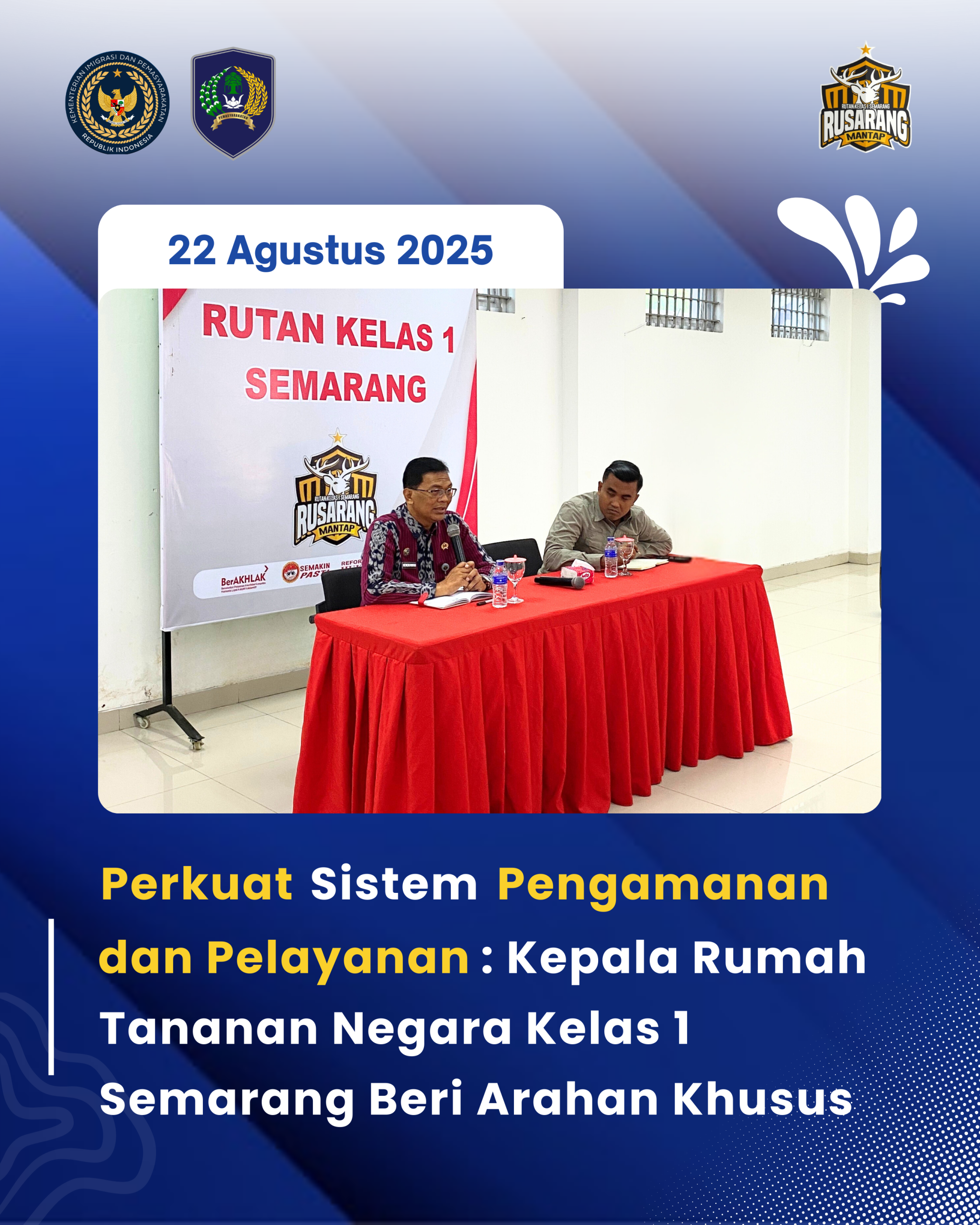 Semarang, Jumat (22 Agustus 2025) – Kepala Rumah Tahanan Negara (Rutan) Kelas I Semarang bersama Kepala Pengamanan Rutan memberikan pengarahan kepada jajaran petugas pengamanan dalam rangka memperkuat sistem keamanan dan meningkatkan kualitas pelayanan di lingkungan Rutan.