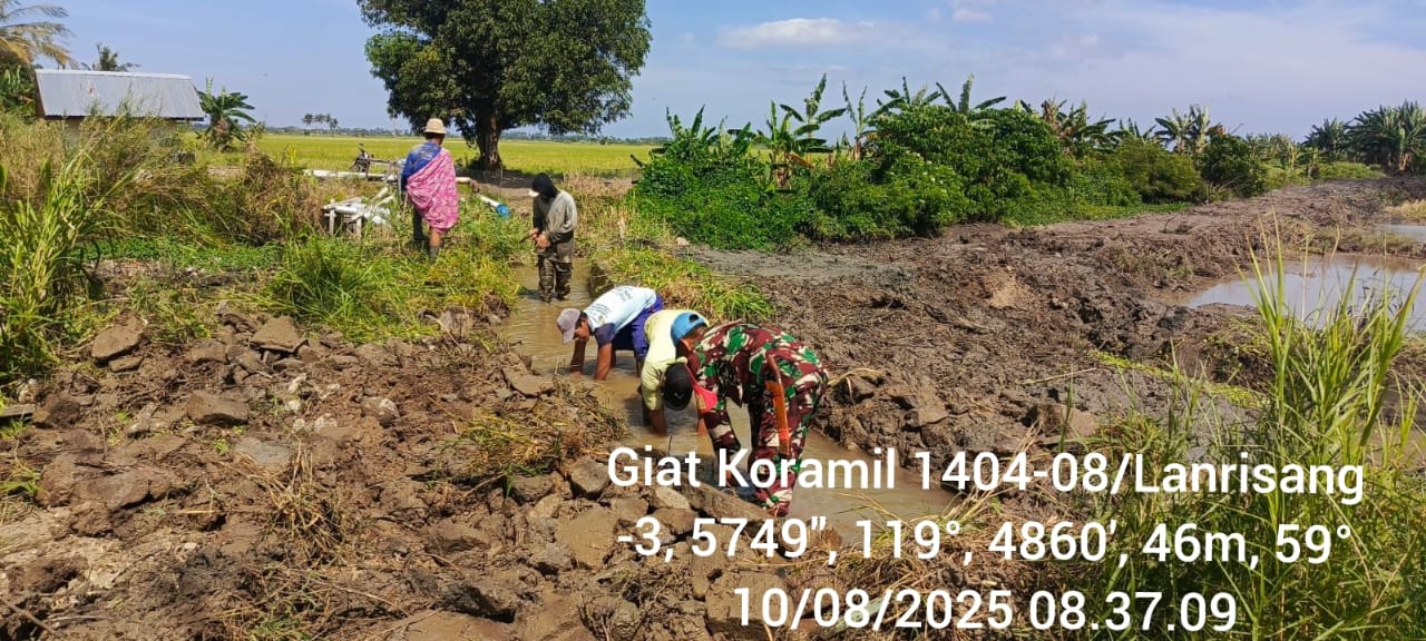 Pinrang_ Untuk memenuhi kebutuhan air persawahan, Babinsa jajaran Koramil-08/Lanrisang Kodim 1404/Pinrang melaksanakan kerja bakti bersama warga pembersihan saluran irigasi guna mendukung proses persiapan turun sawah memasuki musim tanam di Lingkungan Kassi kelurahan Lanrisang Kecamatan Lanrisang Kabupaten Pinrang, Minggu (10/08/2025).