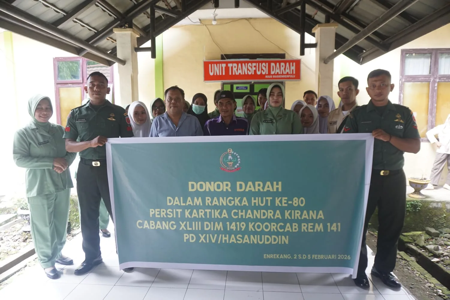 Enrekang – Persit Kartika Chandra Kirana (KCK) Cabang XLIII Kodim 1419/Enrekang menggelar kegiatan bakti sosial donor darah dalam rangka memperingati HUT ke-80 Persit Kartika Chandra Kirana. Kegiatan tersebut dilaksanakan di UTD RSUD Massenrempulu, Jl. Jenderal Sudirman, Kelurahan Galonta, Kecamatan Enrekang, Kabupaten Enrekang, pada Senin (02/02/2026).