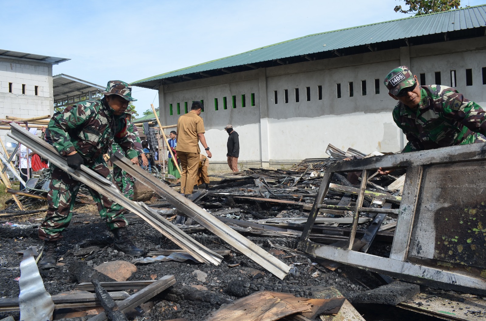 “Sebagai aparat teritorial, kami tidak tinggal diam saja atas musibah yang menimpa masyarakat di wilayah binaan. Kami datang membantu membersihkan puing-puing sisa kebakaran kemarin”, ujar Danramil .