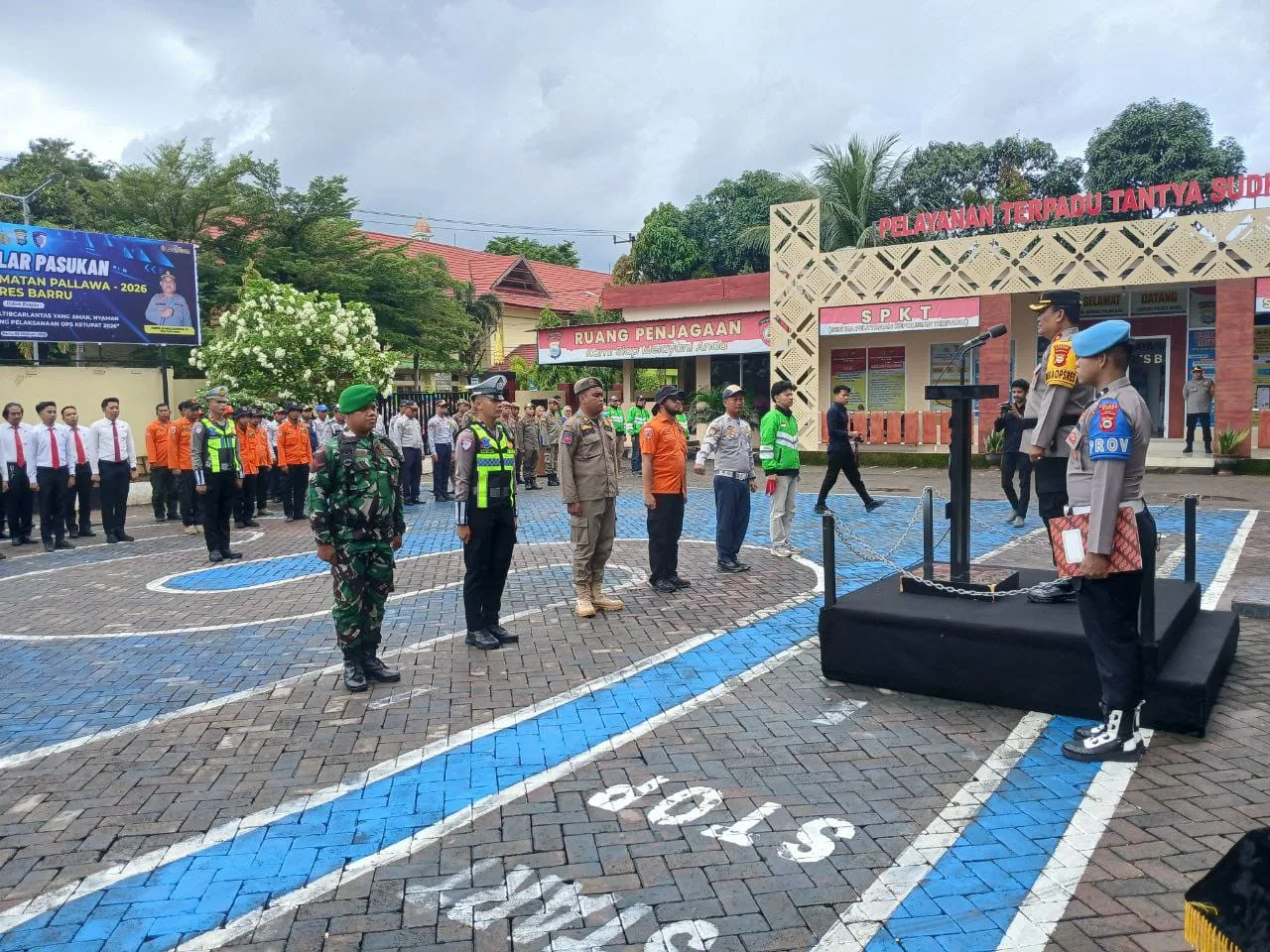 Parepare,- Personel militer Kodim 1405/Parepare dan personel TNI yang berada di wilayah Kabupaten Barru mengikuti Apel Gelar Pasukan Operasi Keselamatan Pallawa Tahun 2026 yang digelar di Halaman Mako Polres setempat, Senin (2/2/2026).