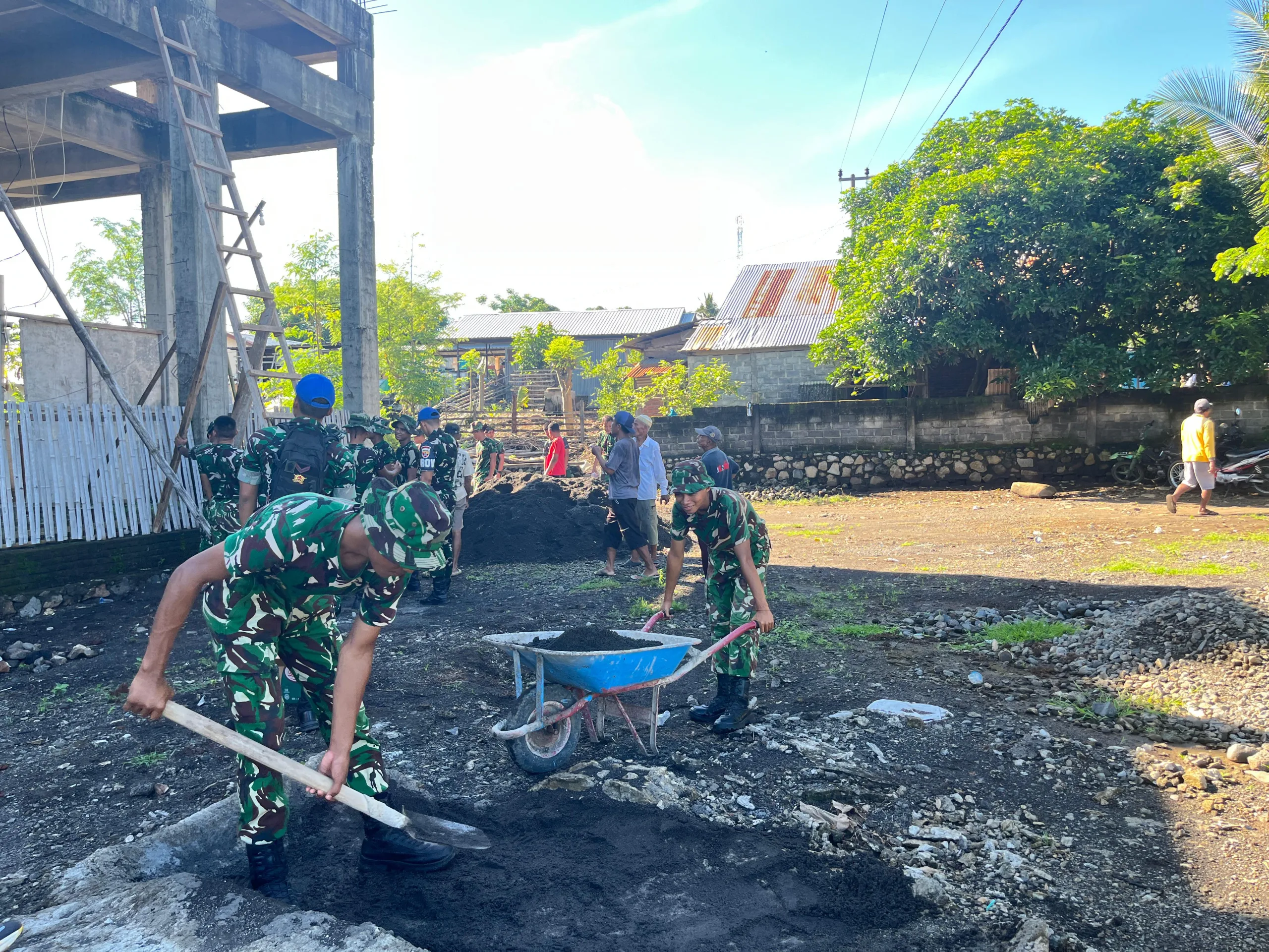 Dalam proses pengerjaan, para prajurit membagi tugas mulai dari pengadukan material, pengangkutan semen, pemasangan rangka baja ringan hingga penataan atap. Kerja sama yang solid membuat proses pengecoran berjalan cepat dan rapi, sekaligus memastikan struktur bangunan memiliki kualitas yang kuat dan aman.