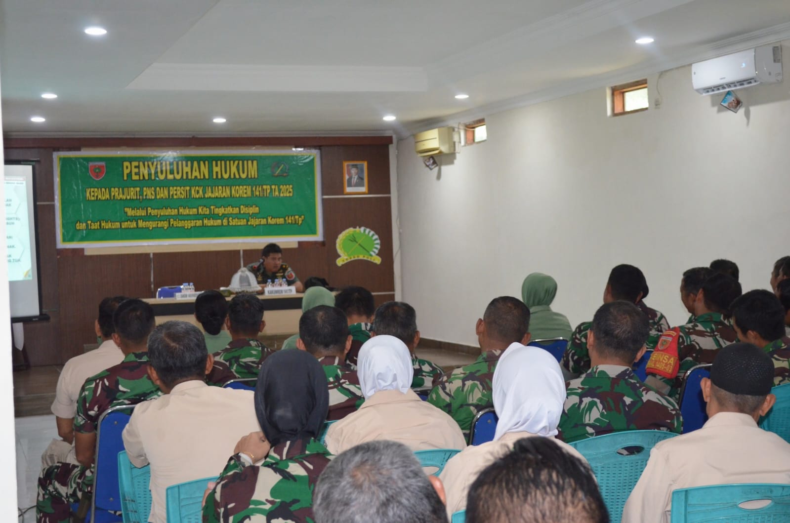 Pada kesempatan tersebut Kepala Hukum (Kakum) Korem 141/Tp, Mayor CHK Tamsil M Djabir, SH. MH., dalam materinya, diantaranya menjelaskan tentang Bantuan Hukum (Bankum) bagi setiap prajurit, PNS dan keluarganya serta proses penyelesaian perkara disiplin dan pidana bagi prajurit dan PNS.