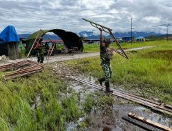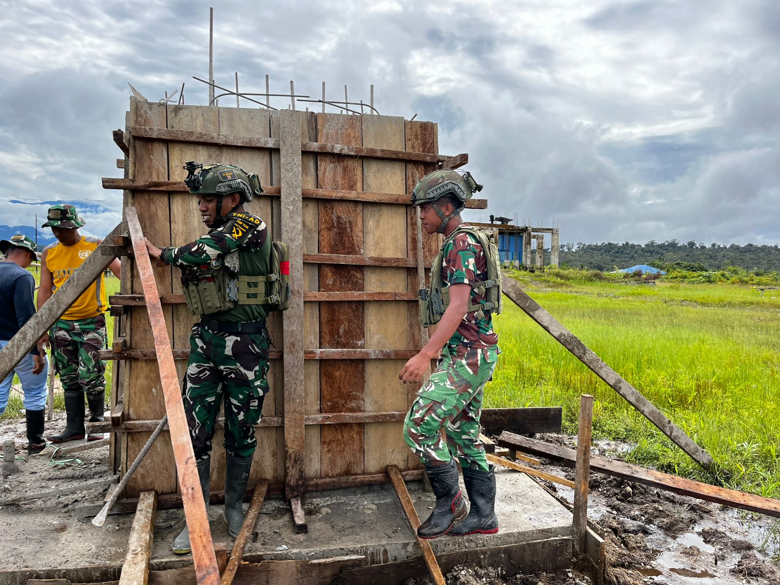 Dengan peralatan sederhana, namun penuh semangat gotong royong, para prajurit dan warga bahu membahu memastikan setiap rangka terpasang dengan kokoh dan presisi.