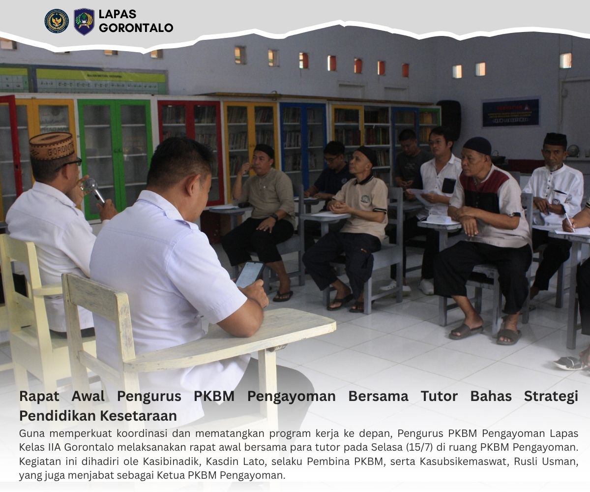 Gorontalo – INFO_PAS – Guna memperkuat koordinasi dan mematangkan program kerja ke depan, Pengurus PKBM Pengayoman Lapas Kelas IIA Gorontalo melaksanakan rapat awal bersama para tutor pada Selasa (15/7) di ruang PKBM Pengayoman. Kegiatan ini dihadiri ole Kasibinadik, Kasdin Lato, selaku Pembina PKBM, serta Kasubsikemaswat, Rusli Usman, yang juga menjabat sebagai Ketua PKBM Pengayoman.