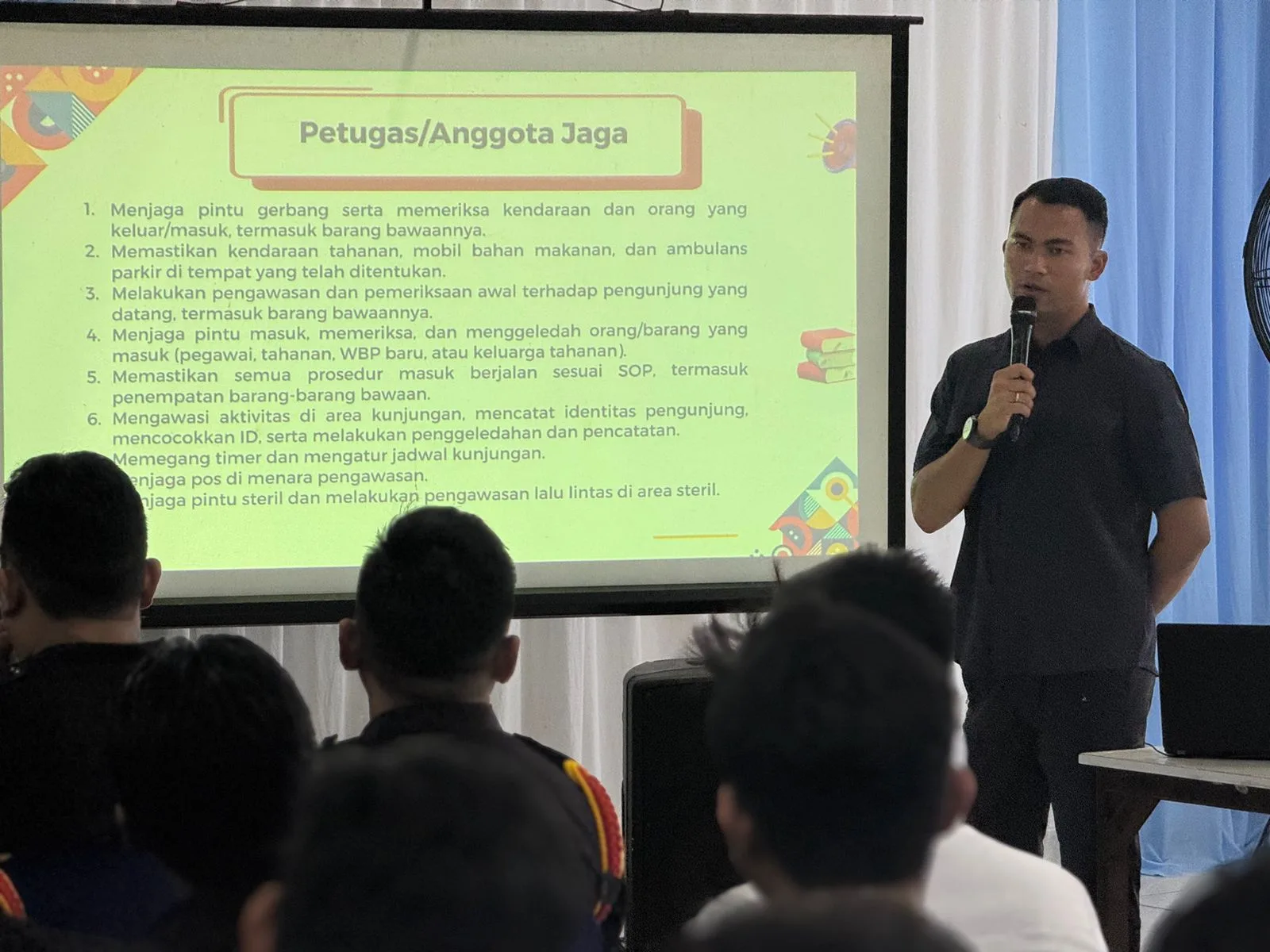 Kegiatan ini dihadiri langsung oleh Kepala Lapas I Made Supartana, pejabat struktural dan diikuti oleh jajaran pengamanan, termasuk Komandan Jaga, anggota jaga, staf KPLP, staf keamanan dan ketertiban (kamtib) sebagai upaya meningkatkan pemahaman serta pelaksanaan tugas pengamanan yang profesional, humanis, dan sesuai dengan Standar Operasional Prosedur (SOP).