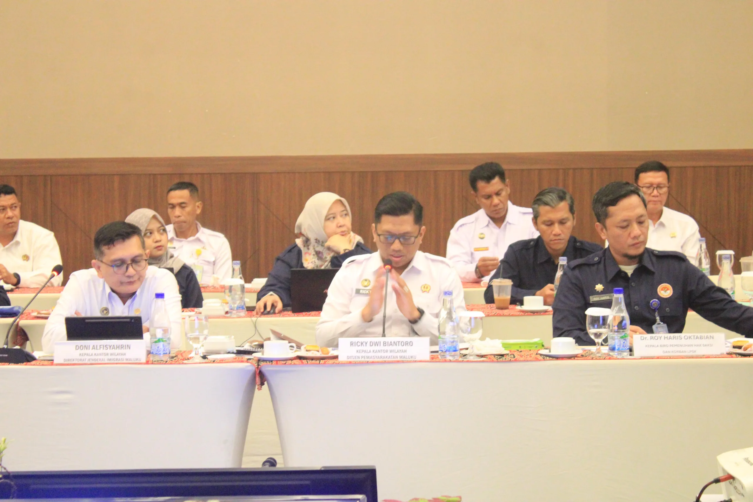 Ricky Dwi Biantoro Selaku Kakanwil Ditjenpas Maluku menyampaikan paparan strategis dalam Rapat Dengar Pendapat (RDP) bersama Komisi XIII DPR RI di Ballroom Hotel Santika Premiere Ambon. Dalam sesi pemaparan, Ricky Dwi Biantoro yang didampingi oleh Para pejabat Administrator serta Kepala Satuan Kerja Lapas dan Rutan Se- Maluku memaparkan berbagai isu pemasyarakatan di Maluku, mulai dari kondisi gambaran umum Pemasyarakatan Maluku, anggaran, infrastruktur, pengawasan dan pencegahan gangguan keamanan serta juga menyampaikan program nasional yang berkaitan dengan program-program prioritas yang telah dilaksanakan diantaranya penanganan overcrowding, pembinaan kepribadian dan kemandirian warga binaan,