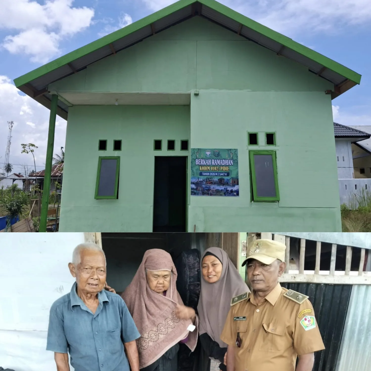 Pidie – Program rehabilitasi Rumah Tidak Layak Huni (RTLH) yang dilaksanakan Kodim 0102/Pidie di Desa Lampoh Krueng, Kecamatan Kota Sigli, Kabupaten Pidie, resmi rampung 100 persen. Rumah milik pasangan lanjut usia, Ibu Mumun Sopiah (75) dan Bapak Jai Mikarja (85), kini telah berdiri kokoh dan siap ditempati, Sabtu (21/02/2026).