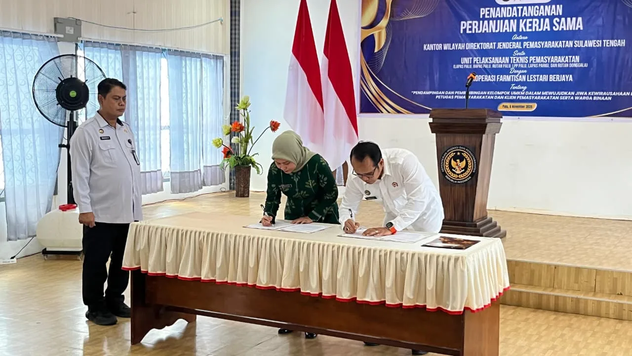 Palu, INFO_PAS– Melalui kegiatan Penandatanganan Perjanjian Kerja Sama (PKS) antara Kanwil Ditjenpas Sulawesi Tengah bersama UPT Pemasrakatan dengan Koperasi Farmatisan Lestari Berjaya, Rumah Tahanan Negara (Rutan) Kelas IIA Palu turut mengambil langkah maju dalam upaya pembinaan kemandirian mereka dengan ikut menandatangani Perjanjian tersebut, Kamis (6/11/2025).