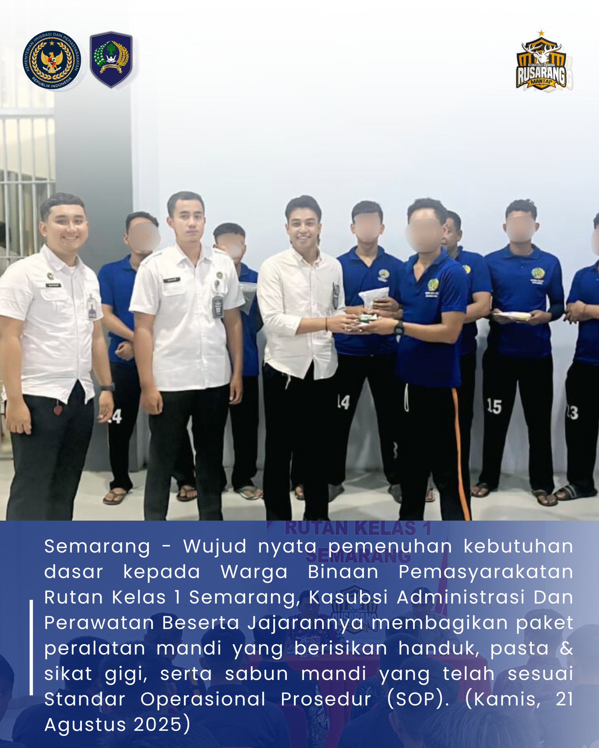 Semarang – Wujud nyata pemenuhan kebutuhan dasar kepada Warga Binaan Pemasyarakatan Rutan Kelas 1 Semarang, Kasubsi Administrasi Dan Perawatan Beserta Jajarannya membagikan paket peralatan mandi yang berisikan handuk, pasta & sikat gigi, serta sabun mandi yang telah sesuai Standar Operasional Prosedur (SOP). (Kamis, 21 Agustus 2025)