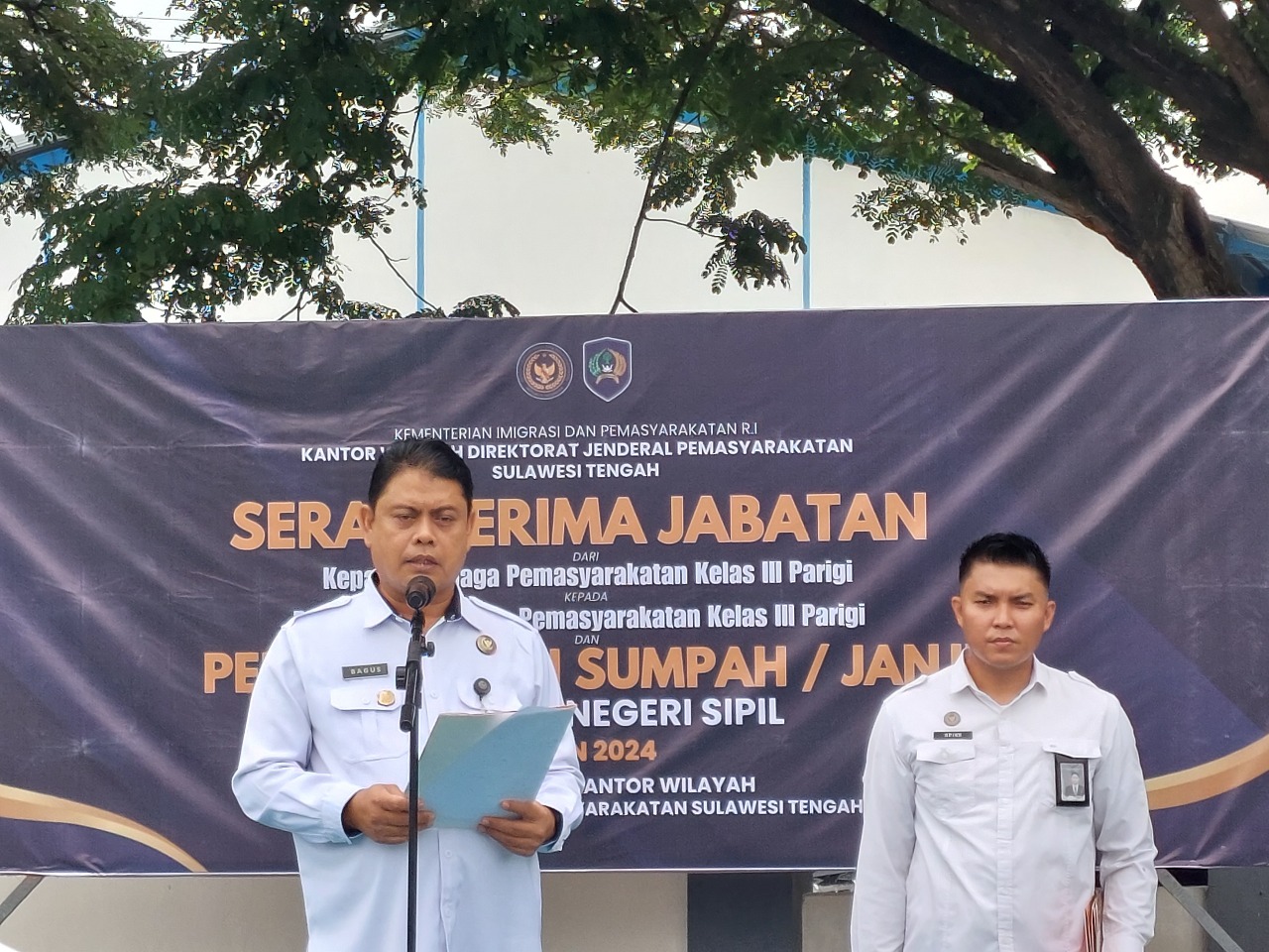 Palu, INFO_Pas-Sebanyak 2 (dua) orang Calon Pegawai Negeri Sipil (CPNS) Angkatan 2023 pada Rumah Tahanan negara (Rutan) Kelas IIA Palu resmi diangkat dan diambil sumpah/janji sebagai Pegawai Negeri Sipil (PNS), dalam sebuah upacara yang berlangsung khidmat di halaman depan, Kantor Wilayah (kanwil) Direktorat Jenderal Pemasyarakatan (Ditjenpas) Sulawesi Tengah, Selasa (6/5).