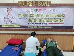 Watampone – Memperingati HUT Bhayangkara Ke-79 Tahun 2025, Komandan Korem 141/Tp Brigjen TNI Andre Clift Rumbayan, S.Sos., M.M. hadiri dan ikut mendonorkan darahnya langsung pada acara Bakti Kesehatan Donor Darah bertempat di Aula Sarja Arya Racana Mapolres Bone Jl. Yos Sudarso Kel. Tibojong, Kec. Tanete Riattang Timur, Kab. Bone Sul-Sel. Kamis (19/06/2025)