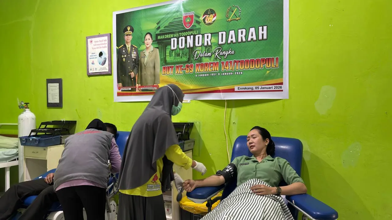 Dalam rangka menyambut Hari Ulang Tahun (HUT) ke-69 Korem 141/Toddopuli, Kodim 1419/Enrekang menggelar kegiatan bakti sosial donor darah dengan tema “Teguh Dalam Keyakinan”. Kegiatan tersebut dilaksanakan di Unit Transfusi Darah (UTD) RSUD Massenrempulu, Jl. Jenderal Sudirman, Kelurahan Galonta, Kecamatan Enrekang, Kabupaten Enrekang, Senin (05/01/2026).