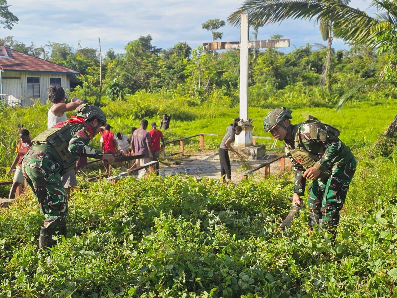 Papua, 05 September 2025 – Satuan Tugas Pengamanan Perbatasan (Satgas Pamtas) Mobile Yonif 733/Masariku bersama masyarakat Kampung Mumugu 2, Distrik Sawa Erma, Kabupaten Asmat, Papua Selatan, melaksanakan kegiatan gotong royong membersihkan lingkungan di sekitar Tugu Salib yang menjadi ikon penting bagi masyarakat setempat. Kegiatan ini dilaksanakan pada hari Jum’at (05/09) sebagai wujud kemanunggalan TNI dengan rakyat serta kepedulian terhadap kebersihan dan keindahan lingkungan.