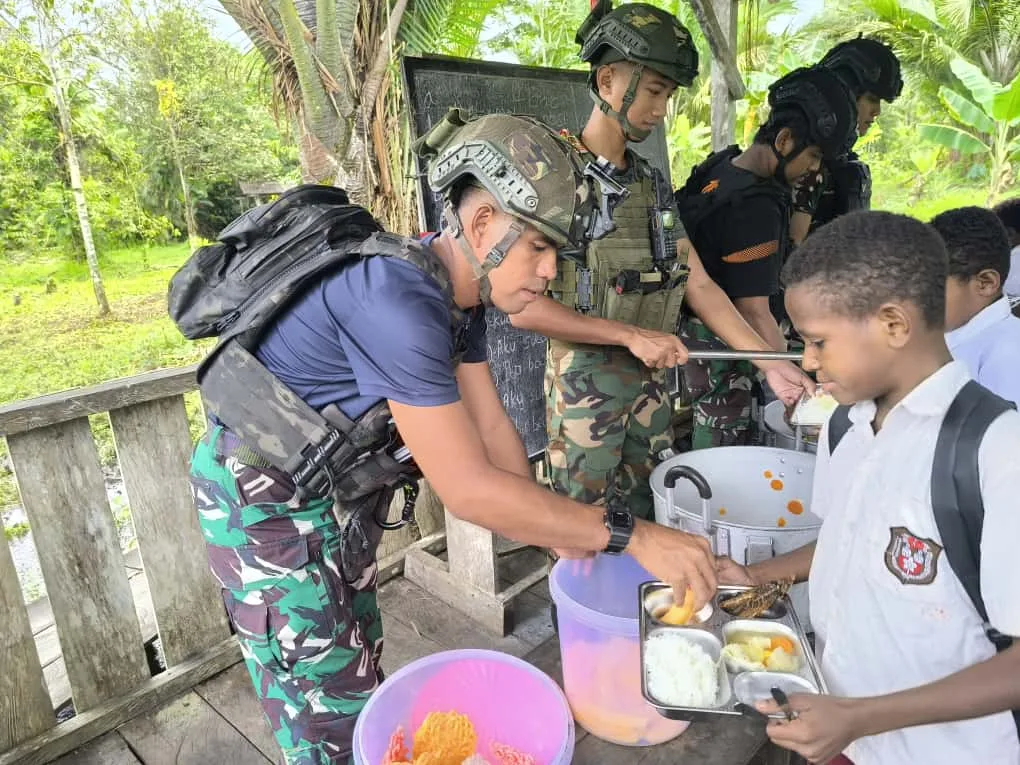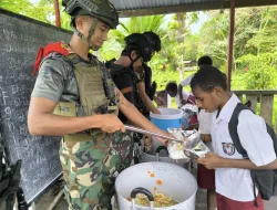 Papua, 11 November 2025 — Di tengah hijaunya pepohonan dan suara riang anak-anak di SD Rimba YPPK Yan Smith Mumugu 2, tampak sekelompok prajurit berseragam loreng sibuk menata piring-piring berisi makanan bergizi. Aroma nasi hangat dan lauk pauk bergizi memenuhi udara pagi itu. Mereka bukan sekadar tentara penjaga perbatasan, tetapi juga sosok saudara yang membawa kepedulian dan kasih, inilah Satgas Pamtas Mobile Yonif 733/Masariku dengan program andalan mereka, “Masariku Peduli Gizi.”