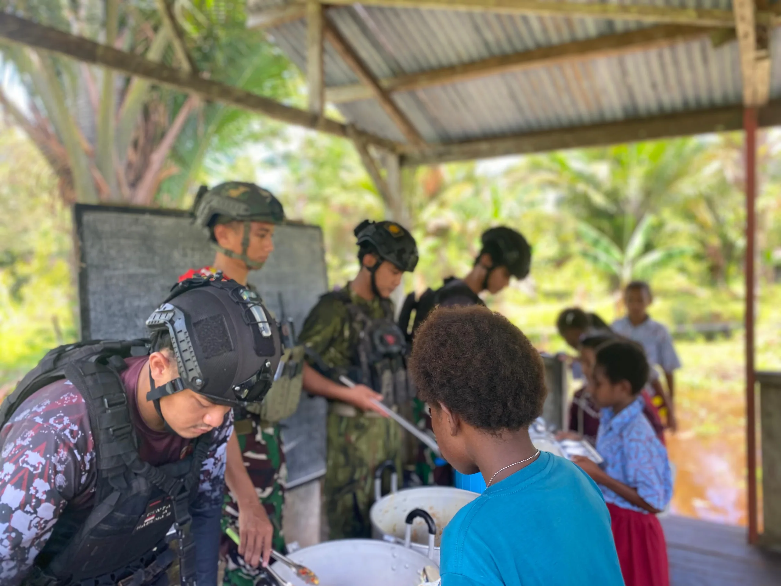 Dengan penuh kehangatan, para prajurit membagikan makanan bergizi gratis yang disiapkan khusus untuk para siswa. Nasi hangat lengkap dengan lauk pauk bernutrisi menjadi wujud nyata perhatian TNI terhadap tumbuh kembang anak-anak di wilayah pedalaman.