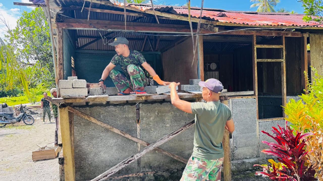 Mengejar terget pengerjaan, Satgas TMMD ke 124 Kodim 1502/Masohi terus bekerja cepat membangun Rumah Tidak Layak Huni (RTLH) yang berada di Desa Waraka Kec. Teluk Elpaputih Kab. Maluku Tengah. Jumat (09/05/2025).