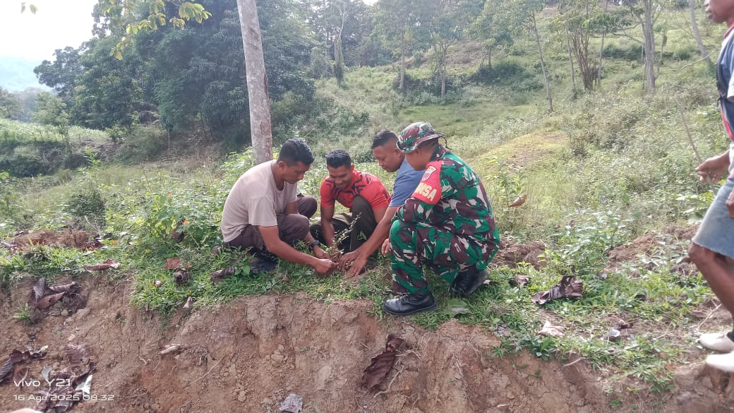 Silih berganti bahu membahu personel TNI POLRI bersama masyarakat membuat lubang untuk penanaman bibit pohon katapan cina dan pohon jati putih, disepanjang pengerasan jalan TMMD untuk mengurangi dampak pemanasan global, menambah sumber oksigen, menyimpan air dalam tanah, menyerap polusi udara, memperindah lingkungan, mencegah banjir dan mencegah erosi.