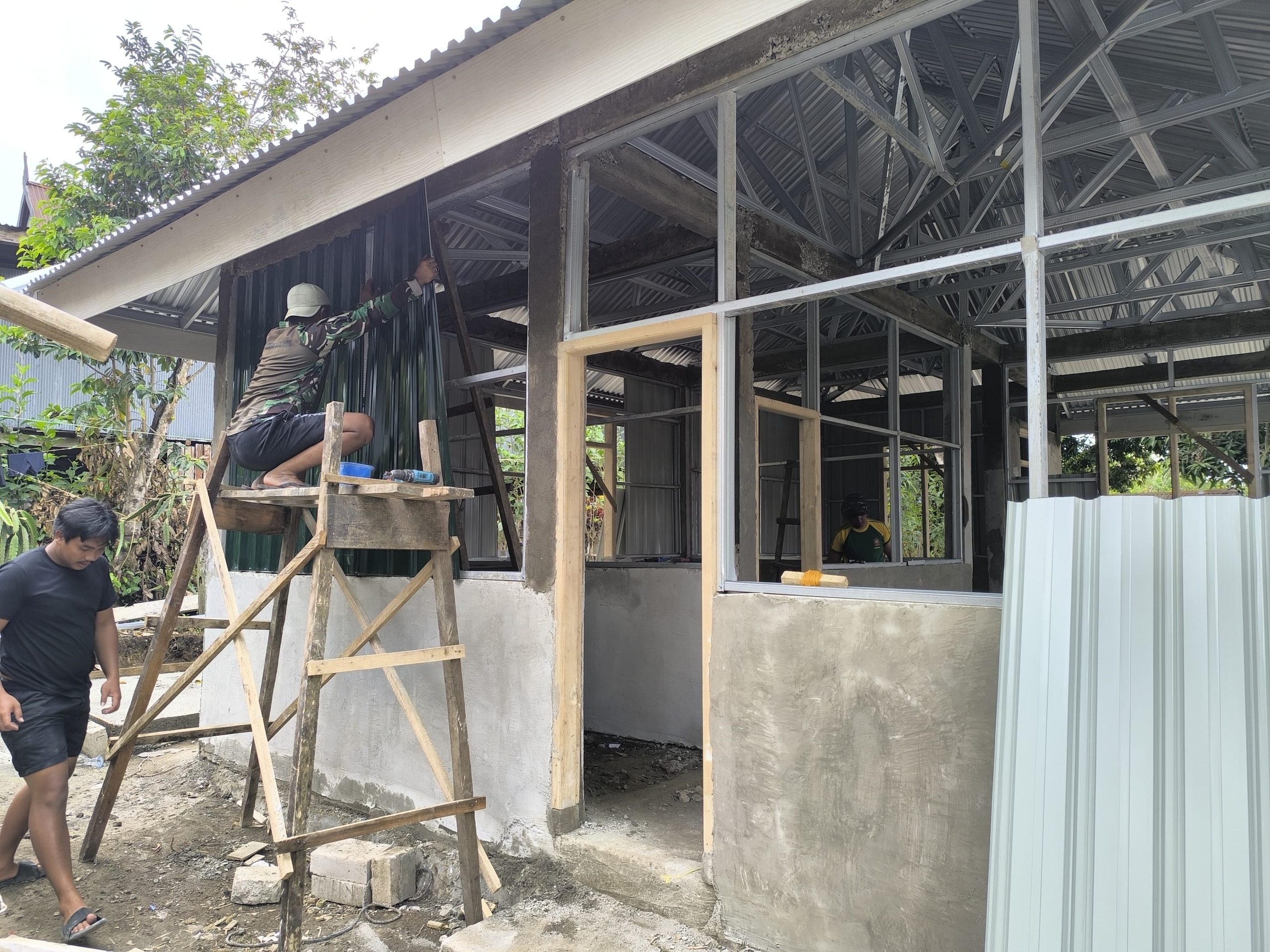 Proses pemasangan dinding dan pengaciang depan rehab Rumah Tidak Layak Huni (RTLH) Sainuddin (50), yang mendapatkan rehab RTLH dari Program TMMD Ke-125 Kodim 122/Maros memakan waktu selama 2 hari, karena dilakukan dengan teliti dan hati-hati supaya hasilnya maksimal. Anggota satgas TMMD dan warga yang lain menyelesaikan pekerjaan pemlesteran dinding bagian dalam rumah.
