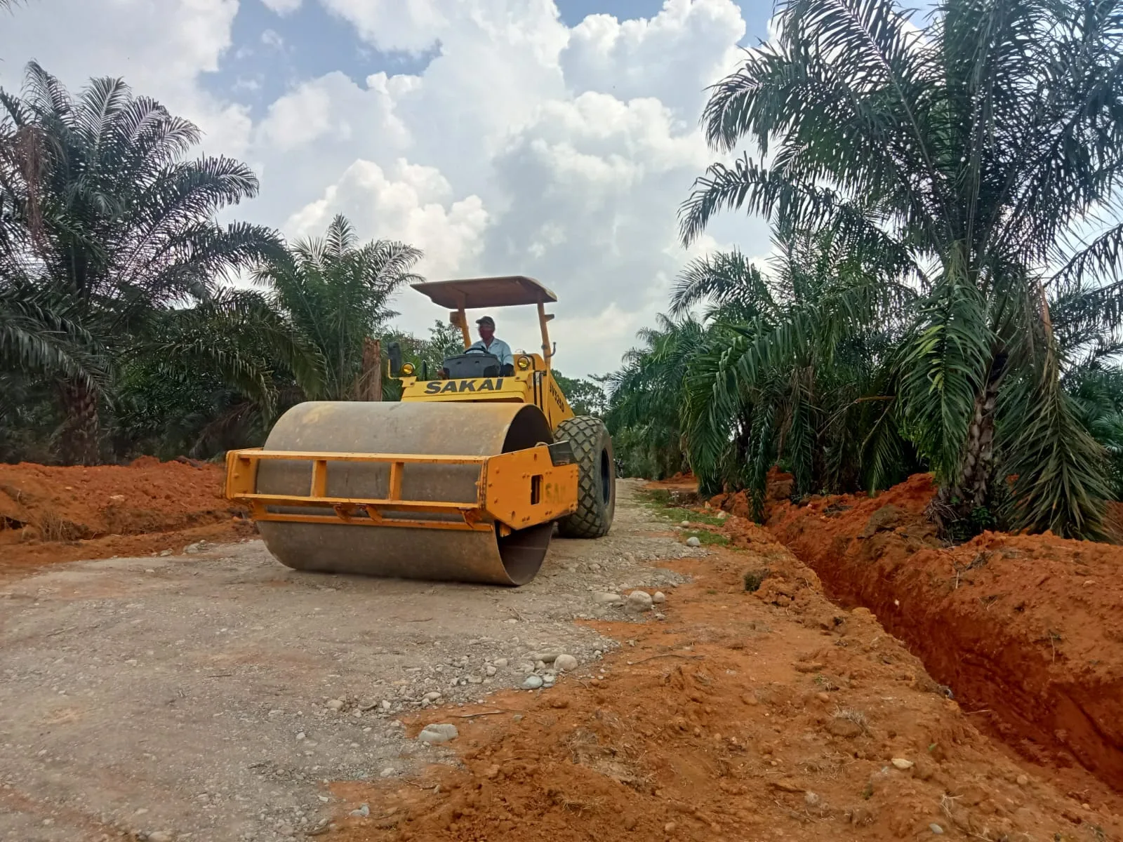 Di tahap akhir pekerjaan ini, vibro bergerak perlahan namun pasti di atas timbunan tanah yang telah diratakan sebelumnya. Roda besarnya menggulung lapisan tanah demi tanah agar semakin padat dan kuat.