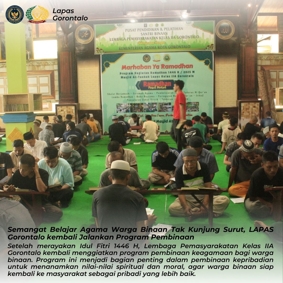 Gorontalo – Setelah merayakan Idul Fitri 1446 H, Lembaga Pemasyarakatan Kelas IIA Gorontalo kembali menggiatkan program pembinaan keagamaan bagi warga binaan. Program ini menjadi bagian penting dalam pembinaan kepribadian untuk menanamkan nilai-nilai spiritual dan moral, agar warga binaan siap kembali ke masyarakat sebagai pribadi yang lebih baik.