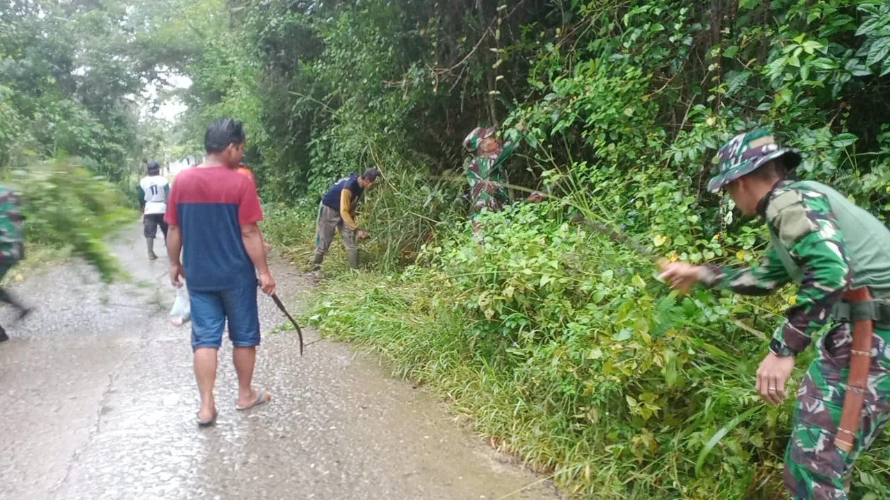 Enrekang — Anggota Koramil 1419-04/Alla bersama pemerintah setempat dan warga Melaksanakan karya bakti pembersihan selokan dari tanah, rumput dan sampah lainnya sepanjang 150 meter di Desa Tallung Tondok Kec. Malua Kab. Enrekang, Rabu 01/10/2025