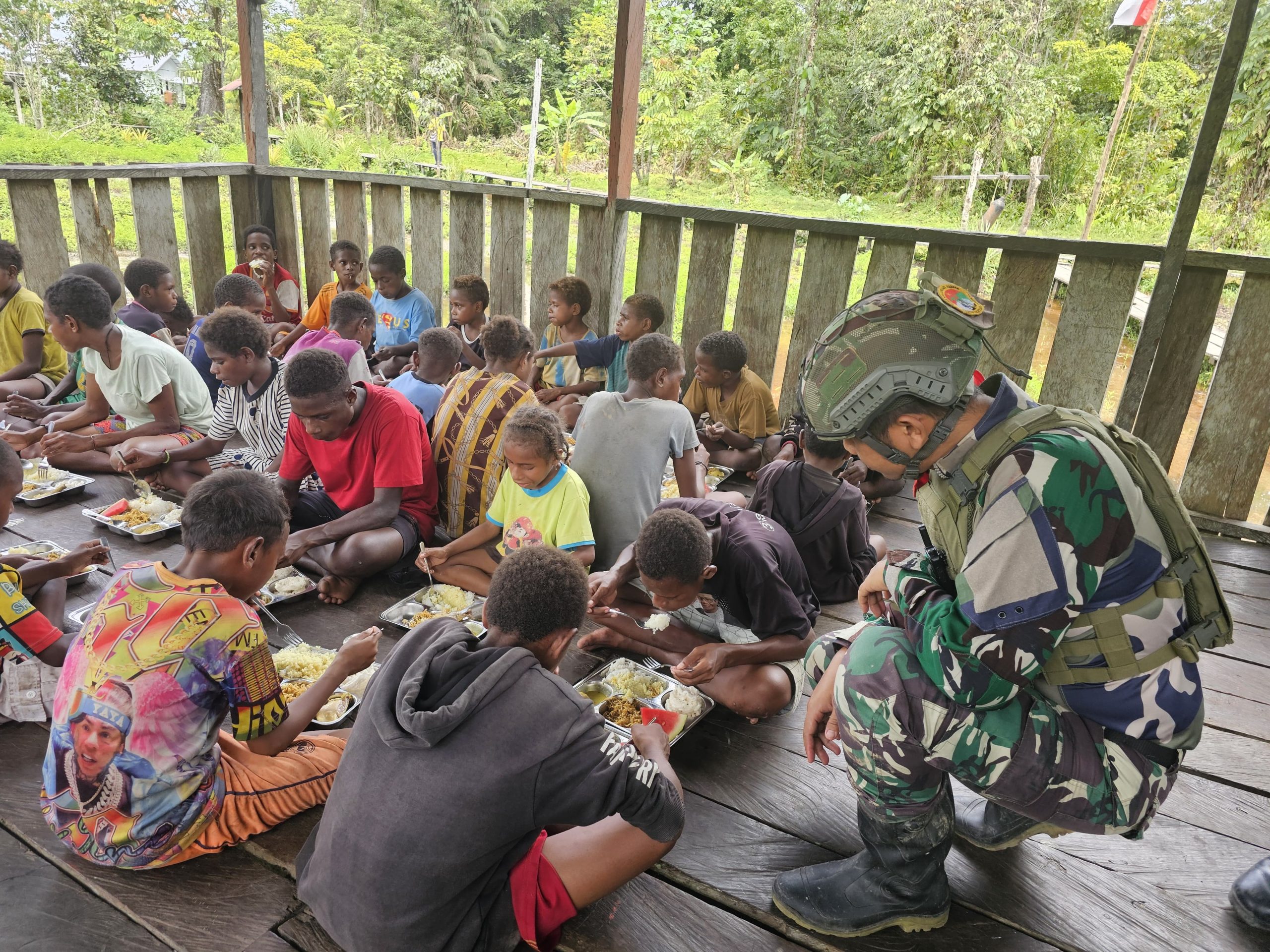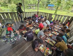 Bayangkan, mata berbinar penuh semangat menyambut kedatangan para prajurit TNI yang membawa sepiring nasi hangat dengan lauk bergizi lengkap. Ayam goreng renyah, ikan segar, telur dadar, sayuran hijau, dan buah-buahan segar menjadi menu istimewa yang disantap dengan lahap oleh seluruh siswa SD Rimba YPPK Mumugu 2.