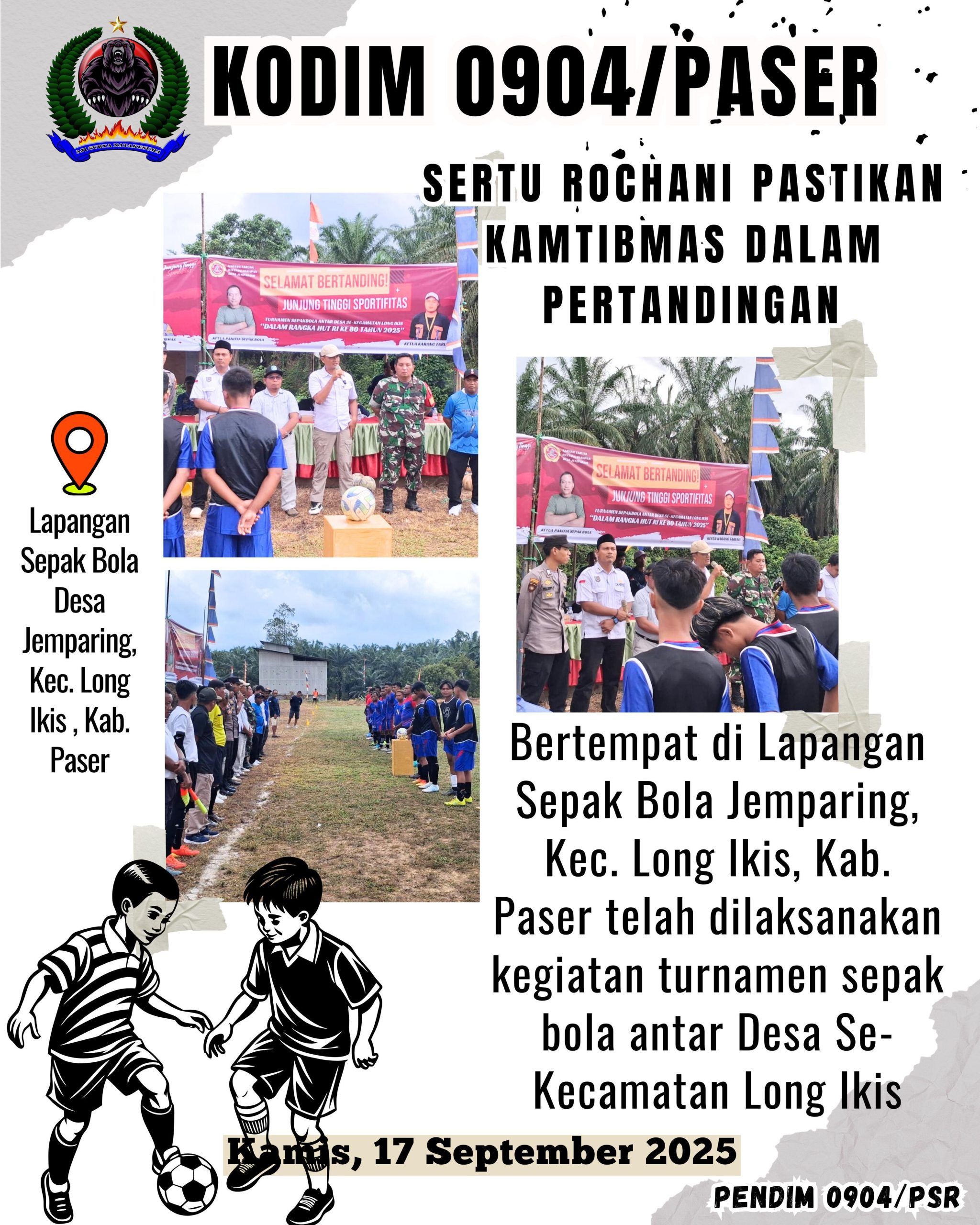 Kodim 0904/Psr, Korem 091/ASN, Kodam VI/Mlw – Bertempat di Lapangan Sepak Bola Jemparing, Kec. Long Ikis, Kab. Paser telah dilaksanakan kegiatan turnamen sepak bola antar Desa Se-Kecamatan Long Ikis, Rabu (18/9/2025).