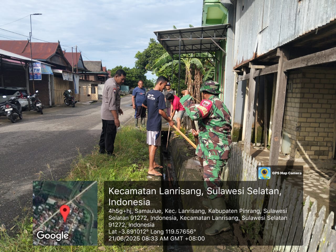 Pinrang_ Sinergitas Babinsa Koramil-08/Lanrisang Kodim 1404/Pinrang Serda Juandar dan Bhabinkiamtibmas Polsek Suppa Aiptu Zainal melaksanakan kegiatan kerja bakti bersama masyarakat setempat dengan sasaran membersihkan saluran air di Dusun Ulo Desa Samaulyue Kecamatan Lanrisang Kabupatren Pinrang, Minggu (22/06/2025).