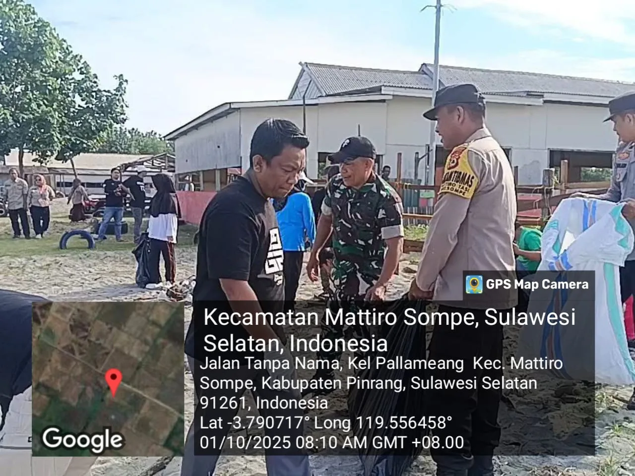 Pinrang_ Babinsa Koramil-02/Mattiro Sompe Kodim 1404/Pinrang Serma Muhajir bersinergi dengan Bhabinkamtibmas Polsek Mattiro Sompe dan masyarakat melaksanakan kegiatan kerja bakti membersihkan pesisir Pantai Ujung Tape di Kelurahan Pallameang Kecamatan Mattiro Sompe Kabupaten Pinrang, Rabu (01/10/2025).