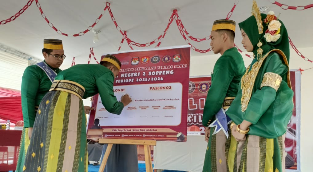 Dalam rangka menyukseskan Pemilihan OSIS (Pemilos) serentak yang akan digelar pada 29 September 2025 di seluruh Sulawesi Selatan, SMAN 2 Soppeng mengadakan kegiatan orasi dan debat terbuka disertai penandatanganan Deklarasi Pemilu Damai, Rabu (24/9).
