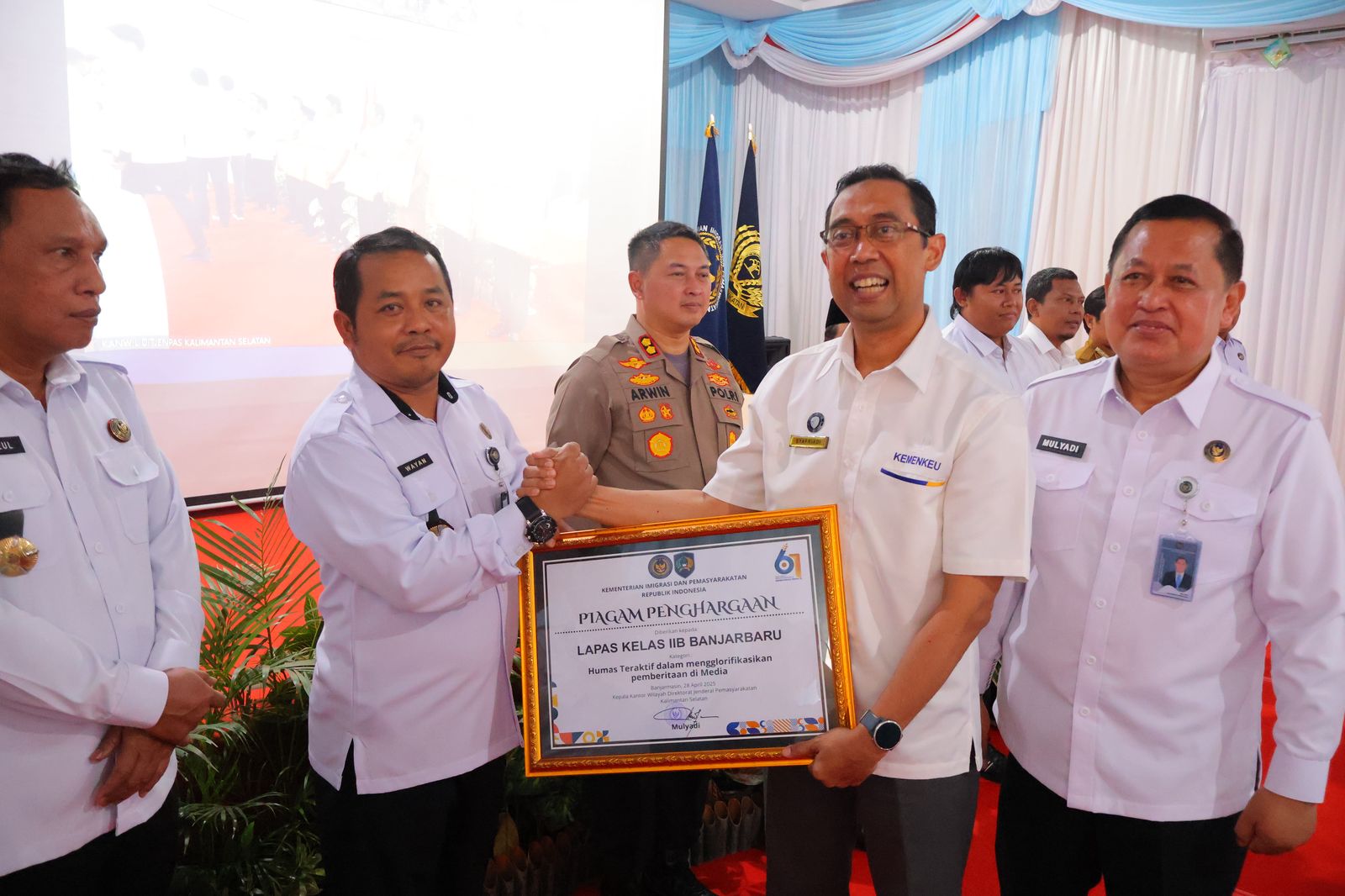 Penghargaan tersebut diberikan oleh Kepala Kanwil Ditjenpas Kalimantan Selatan, Mulyadi, yang diserahkan oleh Kepala Kanwil Ditjen Perbendaharaan Kalimantan Selatan, Syafriadi, kepada Kalapas Banjarbaru, I Wayan Nurasta Wibawa, dalam acara tasyakuran Hari Bakti Pemasyarakatan Ke-61 di Lapas Kelas IIA Banjarmasin, Senin (28/4).