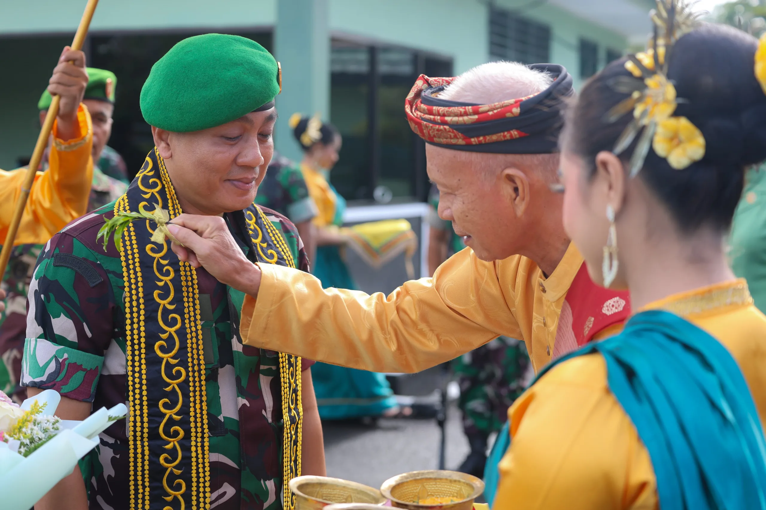Usia menerima penghormatan pejabat Dandim baru beserta istri memasuki Makodim dengan disambut tradisi tepung tawar dan seluruh anggota Kodim, baik TNI, PNS dan Persit Kartika Chandra Kirana Cabang XIX Kodim 0907/Trk.