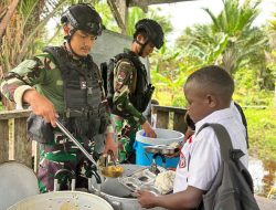Papua — Senin, 28 Juli 2025, suasana hangat penuh semangat menyelimuti SD Rimba Mumugu, Distrik Krepkuri, Kabupaten Nduga. Satgas Pamtas Mobile Yonif 733/Masariku hadir membawa dua misi mulia dalam satu aksi kemanusiaan: menanamkan nilai kebangsaan dan membagikan makanan bergizi bagi anak-anak pedalaman Papua. Kegiatan ini dipimpin langsung oleh Letda Inf Sirajul.