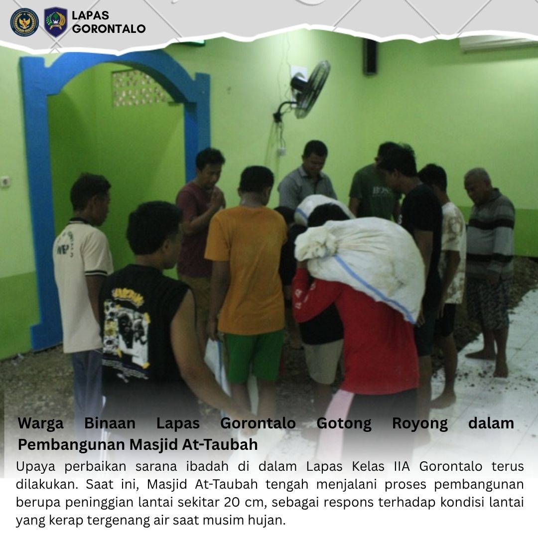 Gorontalo – INFO_PAS – Upaya perbaikan sarana ibadah di dalam Lapas Kelas IIA Gorontalo terus dilakukan. Saat ini, Masjid At-Taubah tengah menjalani proses pembangunan berupa peninggian lantai sekitar 20 cm, sebagai respons terhadap kondisi lantai yang kerap tergenang air saat musim hujan.