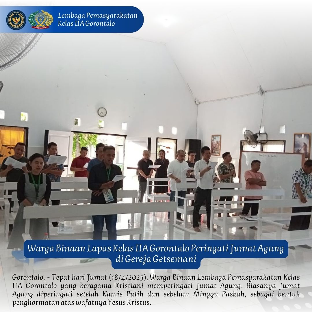 Warga Binaan Kristiani di Lapas Gorontalo melaksanakan kebaktian khusus, doa bersama, dan perenungan spiritual di Gereja Getsemani. Dalam suasana penuh haru dan kekhusyukan, mereka diajak untuk merenungkan makna pengorbanan Yesus serta memperkuat iman dalam menghadapi penderitaan hidup, termasuk menjalani masa pidana.