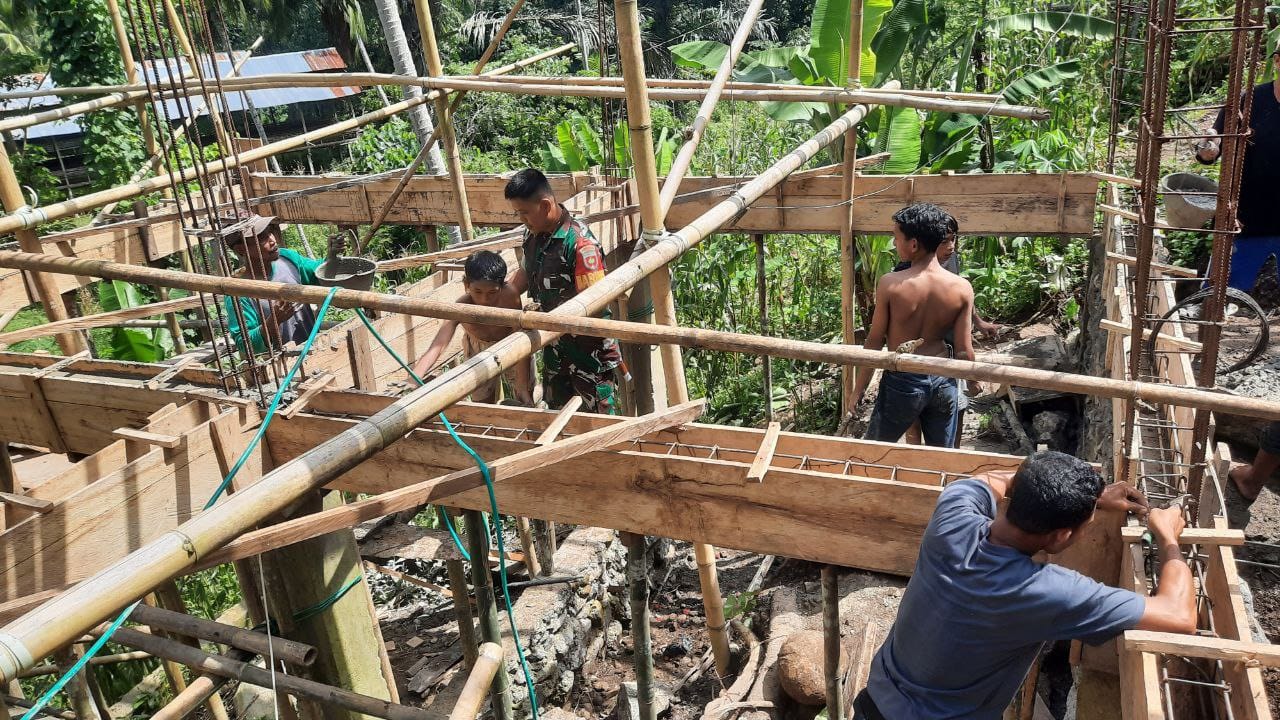 SINJAI – Babinsa Desa Pattongko Koramil 1424-03/Sinjai Tengah Kodim 1424/Sinjai, Serda Asri Bahe, bersama Kepala Dusun Tappilasa dan masyarakat setempat melaksanakan kegiatan gotong royong pengecoran tiang rumah milik Puang Ali. Kegiatan tersebut berlangsung di Dusun Tappilasa, Desa Pattongko, Kecamatan Sinjai Tengah, Kabupaten Sinjai, Sabtu (05/04/2025)