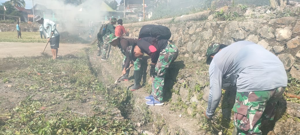 Wujudkan hidup sehat dan eratkan hubungan yang baik dengan warga binaan, Babinsa Koramil 04/Alla Yang di pimping Ba Tuud Pelda Yudin Djoni bergotong royong Melaksanakan Karya Bakti pembersihan Selokan dari tanah, rumput dan sampah lainnya sepanjang 150 meter di Dusun Ra’pa Desa Curio Kec. Curio Kab. Enrekang, Selasa (22/07/2025).