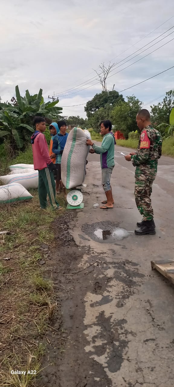Pinrang_ Untuk meyakinkan gabah hasil panen petani dibeli sesuai harga pembelian pemerintah (HPP) dan tanpa potongan, Babinsa Koramil-05/Patampanua Kodim 1404/Pinrang Sertu Deni Agus Subroto mendampingi penggilingan mitra Bulog yang membeli gabah petani di Desa Malimpung Kecamatan Patampanua Kabupaten Pinrang, Senin (28/04/2025).